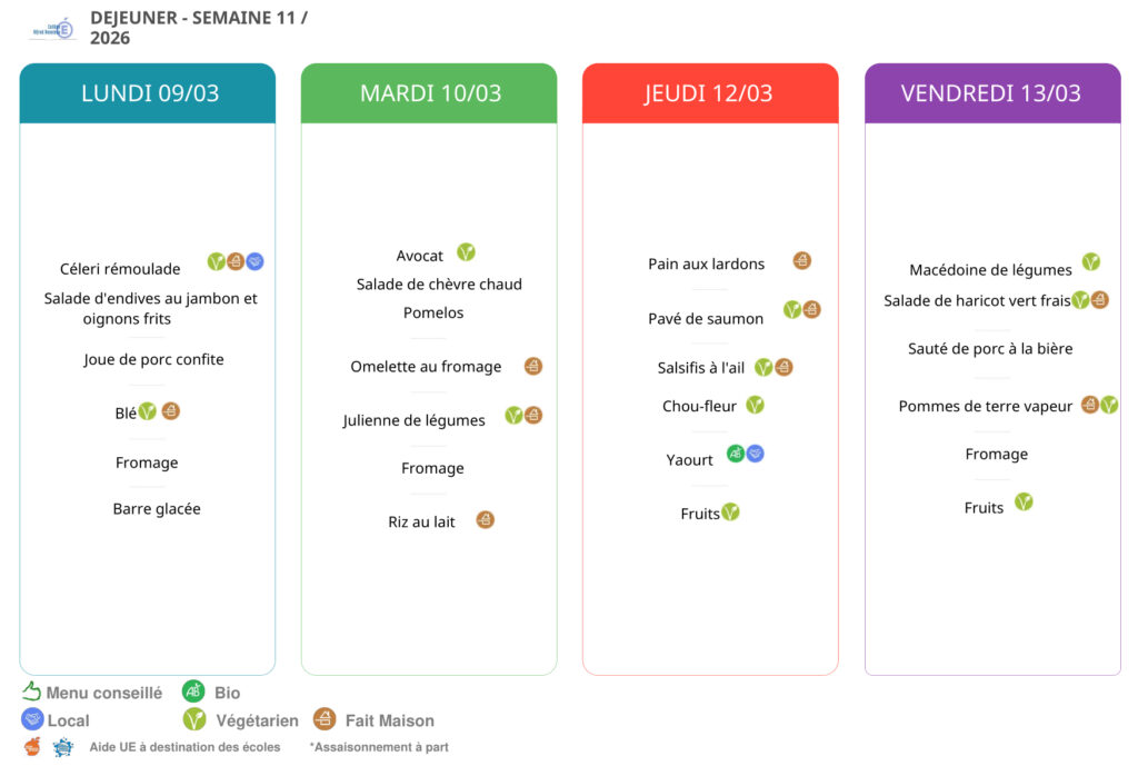 Menus du 9 au 13 mars 2026