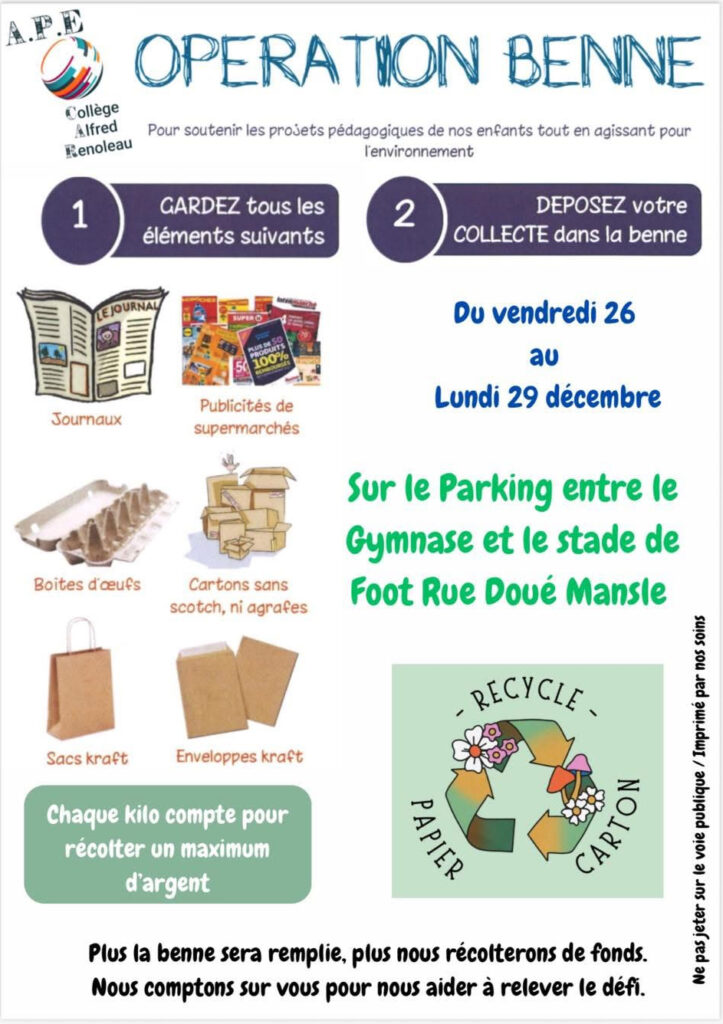 L’Association des Parents d’Élèves organise une collecte de papier du vendredi 26 décembre au lundi 29 décembre.